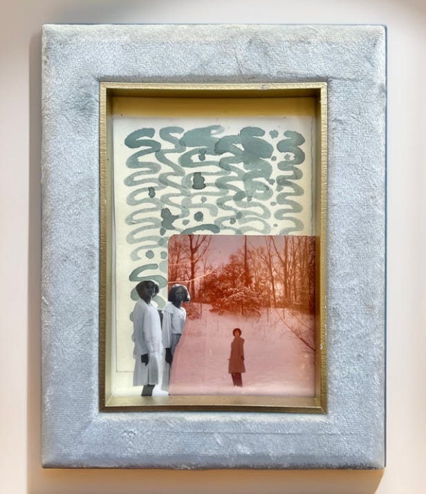 This winter season, I’m staying grounded with collage using family photos and natural paints. Mami Wata (Ocean and Snow) is a reminder that both oceans and snow come from the same primordial element. The spirit of the sea calls to me as I imagine dancing barefoot in warm sand baking beneath an afternoon Sun. When rain falls from the sky during this moment of cold and darkness, it covers the land with a soft white blanket. In a pink polaroid image, my grandmother dances in snow with the trees as these silent creatures gaze down from above.
